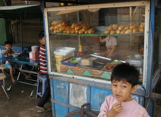 フランスパンみたいな硬いパンを切って具を挟んでくれるんだけど、そこはカンボジアだから切り方が雑。いかにも切れなそうな包丁でギコギコと切って、適当に具を入れて、こっちの好みも聞かずにわけわからんソースやらタレやらをかけてくれる。
